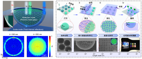针对以上技术瓶颈,研究团队首先从结构着手,创制出一种由周期性纳米晶格构成的微米尺度半球形结构(图1),该结构通过协同光子晶格与光学界面的耦合作用,对多尺度下的光学传输行为进行精准调控,使得单元结构呈现丰富的色彩变幻,犹如万花筒般一转千色。在规模化制备方面,团队研发了高通量按需打印与卷对卷连续制造工艺,就像报纸印刷一样,将柔性基材从一个滚筒连续输送到另一个滚筒,连续完成纳米级精度打印成型,这一技术可将低成本聚合物纳米材料快速制备为单像素性能定制的光学超材料,实现跨越多个尺度的精准制造。