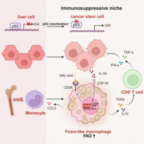 该研究构建p53野生型和p53突变型的小鼠自发肝癌模型并采用转录组测序技术和单细胞测序技术发现,p53突变的肝癌上调白细胞介素34的表达,而敲除Il34可以抑制肝癌的进展并延长小鼠的生存时间。进一步,研究发现,p53直接转录抑制Il34,且p53突变导致肿瘤干细胞分泌白细胞介素34,促使肿瘤相关巨噬细胞聚集在肿瘤干细胞的周围。同时,白细胞介素34上调巨噬细胞中CD36的表达,增强巨噬细胞对于脂质的摄取并转变为脂肪酸氧化代谢模式,进而使得巨噬细胞获得促肿瘤的表型,抑制CD8T细胞的抗肿瘤免疫反应。该研究通过阻断IL-34-CD36轴和PD-1抗体进行联用治疗p53突变的肿瘤发现,单独的PD-1抗体治疗对于p53突变肿瘤效果不明显,而联合治疗可以发挥相对较强的抗肿瘤效应。这表明,对TP53基因突变的癌症患者来说,阻断IL-34信号或是有效的个性化免疫疗法。