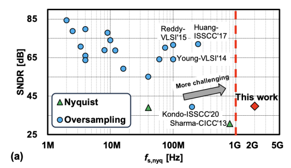随着人工智能、超高速无线、有线互联技术的发展,面向GHz级带宽信号处理的高速模数转换器需求日益迫切。同时,先进的互补金属氧化物半导体工艺正向低电压、高集成度方向演进,传统依赖模拟放大器的模数转换器架构,在速度、功耗和工艺可扩展性等方面面临挑战。因此,基于压控振荡器的模数转换器(VCO-based ADC)凭借高度数字化、结构简洁、适配先进工艺的优势,成为实现高性能数据转换的重要技术方向,但其工作频率难以突破GHz级瓶颈,制约了进一步发展。