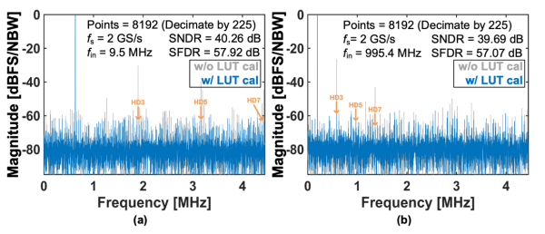 此外,该架构无需数字差分模块,提高了系统对触发器亚稳态的容忍度和整体鲁棒性。在电路实现方面,团队提出了自适应重置技术,实现了压控振荡器重置电压与振荡摆幅的匹配;在粗量化器和细量化器中分别引入动态开关缓冲结构与相位折叠技术,以提高相位提取效率并降低硬件开销。该芯片基于22nm互补金属氧化物半导体工艺,核心面积仅0.0022 mm2,支持500 MS/s至2.5 GS/s的采样速率范围。在2 GS/s采样速率下,实测信噪失真比达到39.1 dB,Walden能效指标低至31.3 fJ/conv-step。