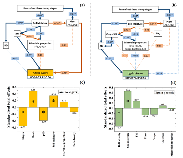 科研团队在青藏高原祁连山地区发生热融滑塌的地区采集土壤样品,利用氨基糖和木质素酚类为生物标志物,表征微生物残体与植物木质素在土壤中相对丰度,研究热融滑塌过程中不同有机碳组分(微生物来源和植物来源)变化及其控制因素。研究发现,热融滑塌引起了土壤~61%的有机碳损失,损失的有机碳中54%由微生物残体碳组成,起主导作用。氨基糖变化主要与土壤含水率、pH、植被状况相关,木质素变化主要与土壤水分和容重变化相关。该研究揭示了热融滑塌引起不同来源的有机碳损失的差异及其控制因子,加深了多年冻土快速退化造成碳损失过程和机理的认识。