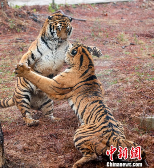2022129日,武汉九峰森林动物园里,两只东北虎在嬉戏打闹。中新社记者 张畅摄