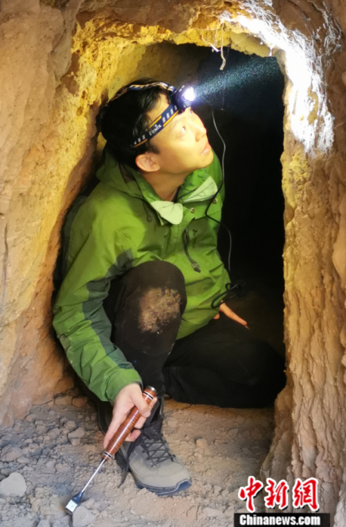 2020年,孙博阳在山西保德野外考察时探洞。中新社发 受访者供图