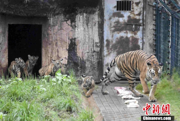 20209月,长沙生态动物园的华南虎“妈妈”和它的“宝宝们”。中新社记者 杨华峰摄