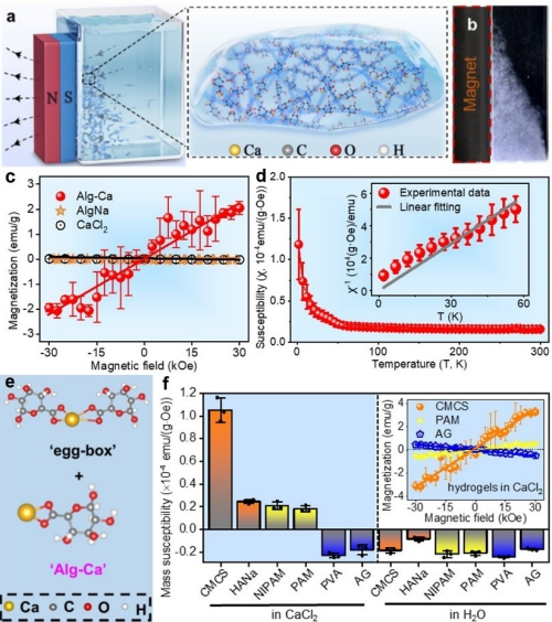 研究团队以海藻酸水凝胶为模型发现:在常规条件下,一个钙离子与两个羧基结合会形成经典的无净磁矩的“蛋盒”结构;在钙离子相对浓度升高时,碳氧双键的π电子离域特性,使钙与羧基耦合能量提高,此时单个钙与单个羧基形成相对稳定的“Alg—Ca”复合体,其钙离子只获得一个外层电子,存在未成对电子,表现出顺磁性。这一发现表明,该机制普遍存在于各种富含羧基或酰胺基的水凝胶及人体内常见的生物分子中。